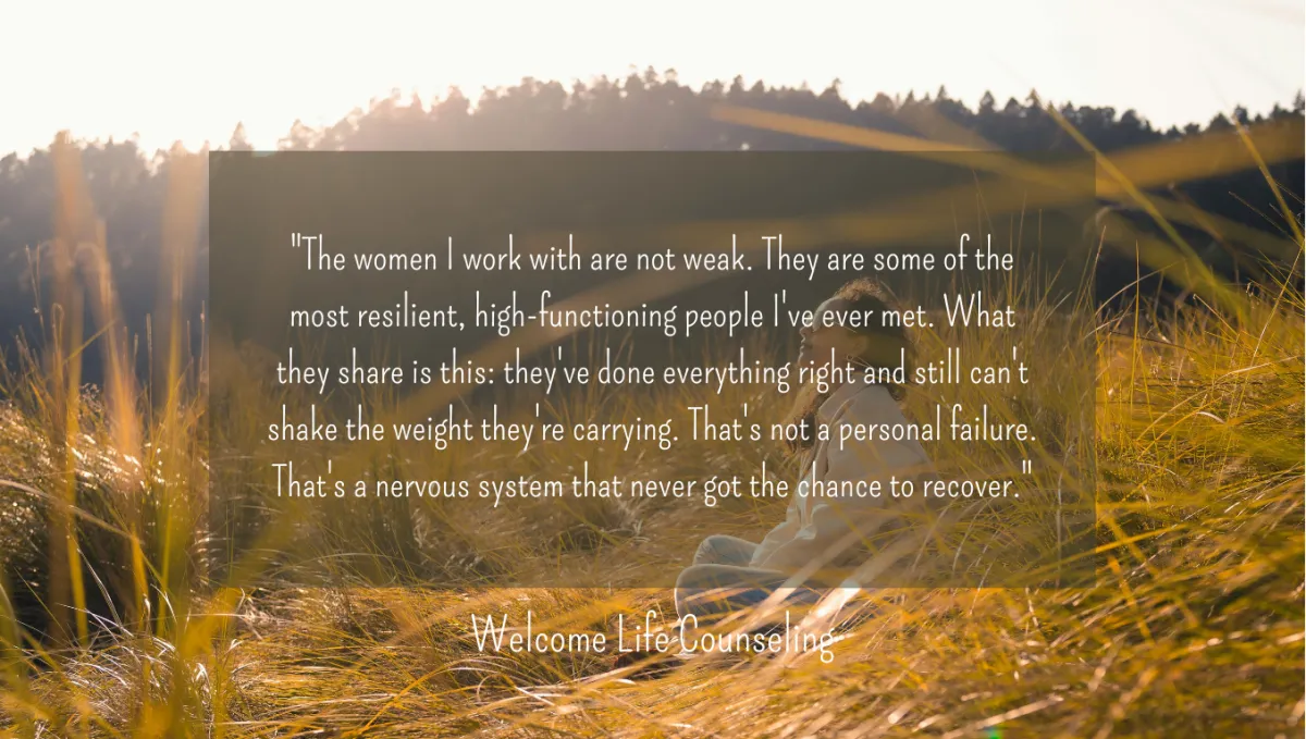 "The women I work with are not weak. They are some of the most resilient, high-functioning people I've ever met. What they share is this: they've done everything right and still can't shake the weight they're carrying. That's not a personal failure. That's a nervous system that never got the chance to recover."