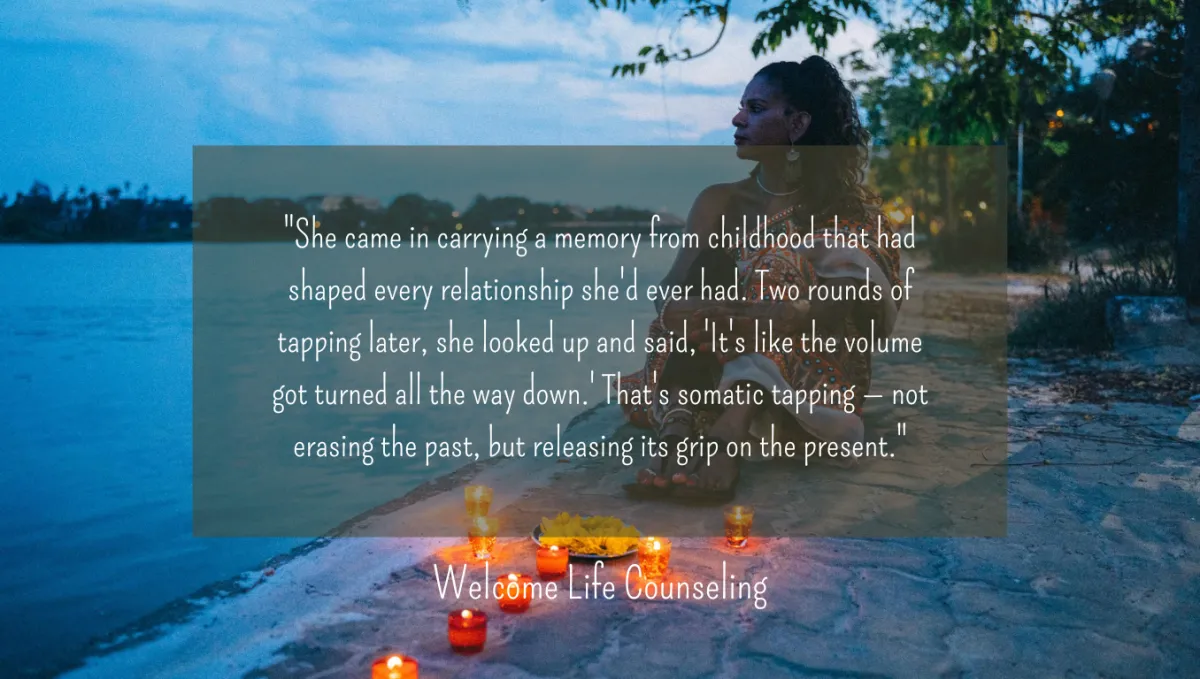 "She came in carrying a memory from childhood that had shaped every relationship she'd ever had. Two rounds of tapping later, she looked up and said, 'It's like the volume got turned all the way down.' That's somatic tapping — not erasing the past, but releasing its grip on the present."